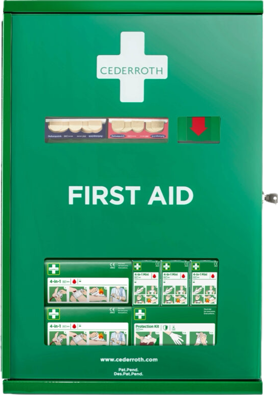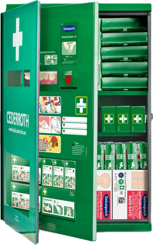 Första Hjälpen skåp särskilt anpassat för arbetsplatser med utsatt miljö, t ex smuts, damm och fukt. Skåpet är i plåt och har två dörrar som delas in i två sektioner. Den yttre sektionen är uppbyggd som en Första Hjälpen tavla med lätt åtkomliga Första Hjälpen produkter. En plexiglasdörr skyddar produkterna mot damm och fukt. Skåpets inre sektion består av ett låsbart utrymme med ett stort lager av påfyllningsprodukter.